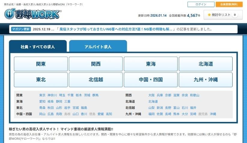 「野郎WORK」は、男性向け求人に特化した広告サイトのなかでも、ホストクラブの内勤・裏方求人の掲載実績が非常に多いサイトです。