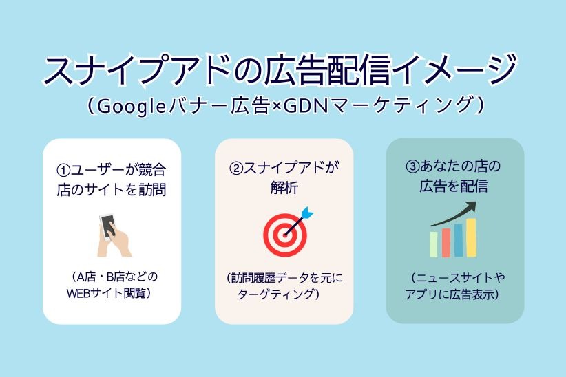 スナイプアドは、Googleのディスプレイネットワーク(GDN)を活用し、競合店のWebサイトを訪れたユーザーに自店舗の広告を表示できるWEB広告手法です。